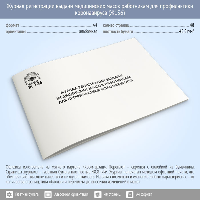 Журнал регистрации выдачи медицинских масок работникам для профилактики коронавируса (48 стр., Ж136) в Сочи купить