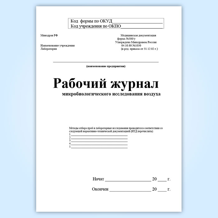 Рабочий журнал микробиологического исследования воздуха (форма 380/у) в Сочи купить