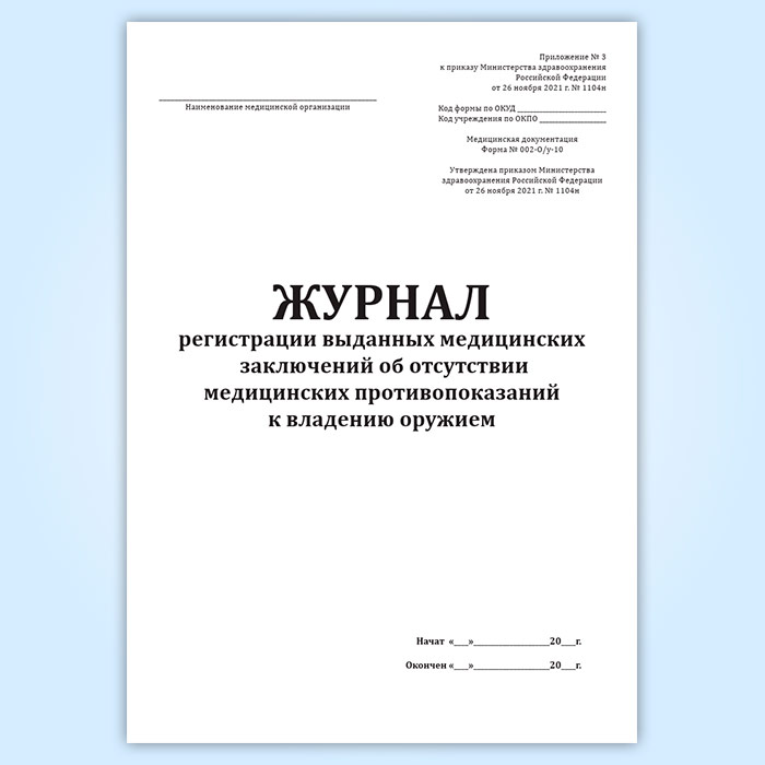 Журнал регистрации выданных медицинских заключений об отсутствии медицинских противопоказаний к владению оружием (форма 002-О/У-10) в Сочи купить