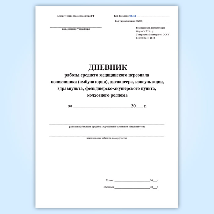 Дневник работы среднего медицинского персонала поликлиники (амбулатории), диспансера, консультации, здравпункта, фельдшерско-акушерского пункта, колхозного роддома (форма 039-1/у) в Сочи купить