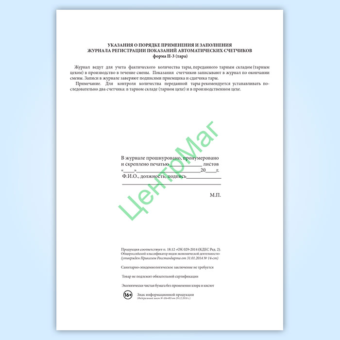 Журнал регистрации показаний автоматических счетчиков (форма № П-3 тара) в Сочи купить