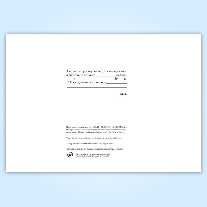 Вы получаете печатную продукцию прошнурованной и c местом для вашей печати в соответствии с действующими нормативными документами: