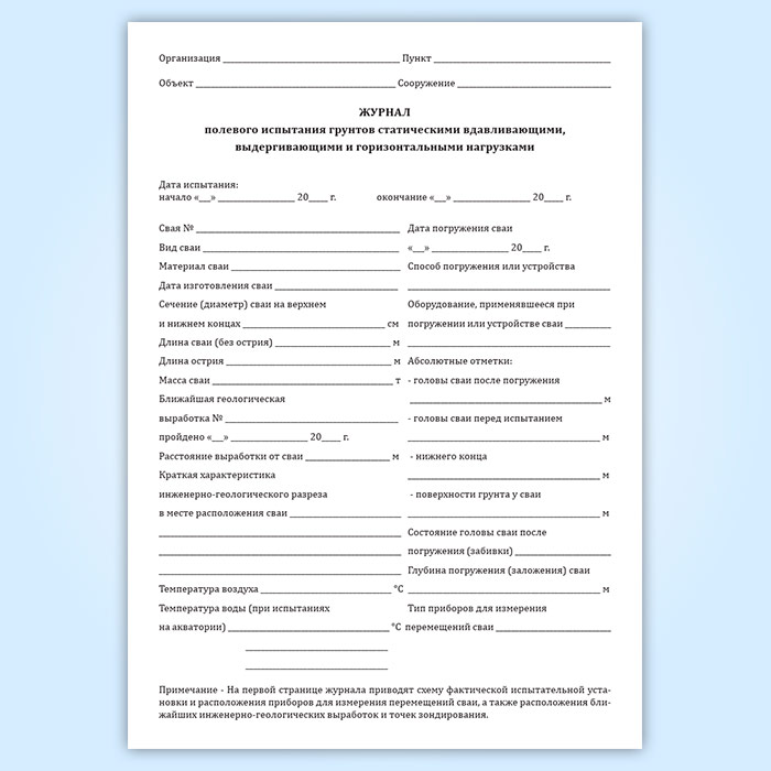 Журнал полевого испытания грунтов статическими вдавливающими, выдергивающими и горизонтальными нагрузками в Сочи купить
