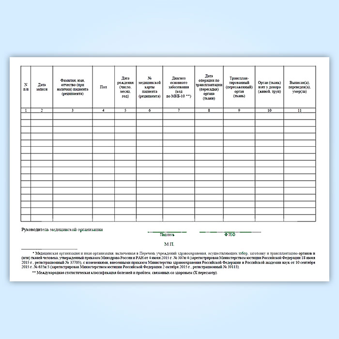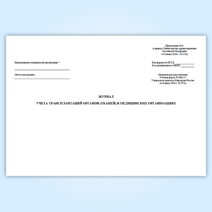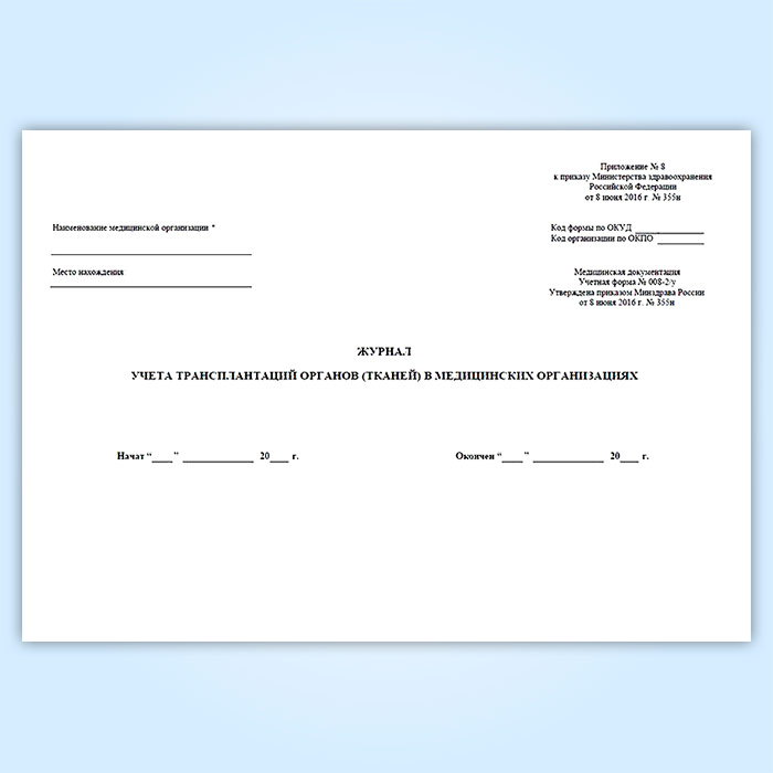 Журнал учета трансплантаций органов (тканей) в медицинских организациях (форма № 008-2/у) в Сочи купить