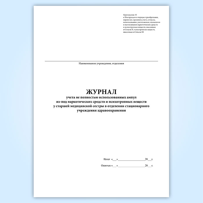 Журнал учета не полностью использованных ампул из-под наркотических средств и психотропных веществ у старшей медицинской сестры в отделении стационарного учреждения здравоохранения в Сочи купить