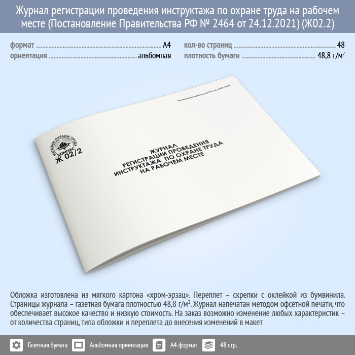 Журнал регистрации проведения инструктажа по охране труда на рабочем месте (Постановление Правительства РФ № 2464 от 24.12.2021) (48 стр., Ж02.2) в Сочи купить