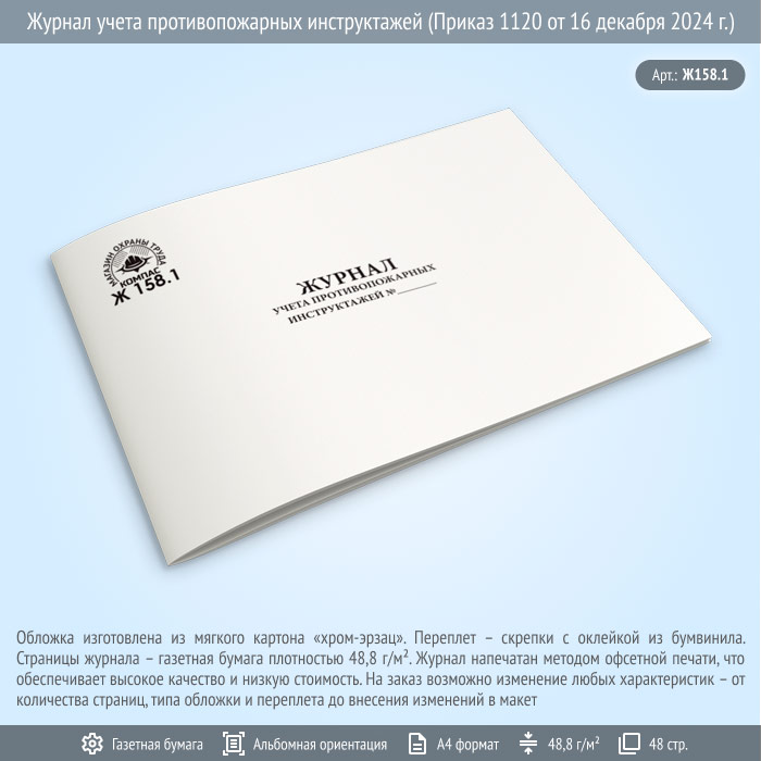 Журнал учета противопожарных инструктажей (Приказ 1120 от 16 декабря 2024 г.) (48 стр., Ж158.1) в Сочи купить