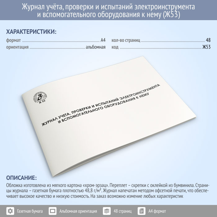Журнал учета, проверки и испытаний электроинструмента и вспомогательного оборудования к нему (48 стр., Ж53) в Сочи купить