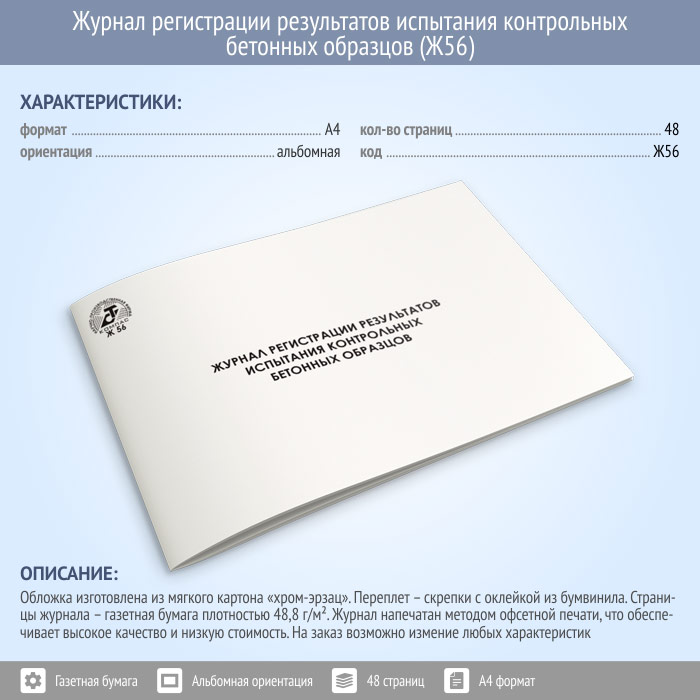 Журнал регистрации результатов испытания контрольных бетонных образцов (48 стр., Ж56) в Сочи купить