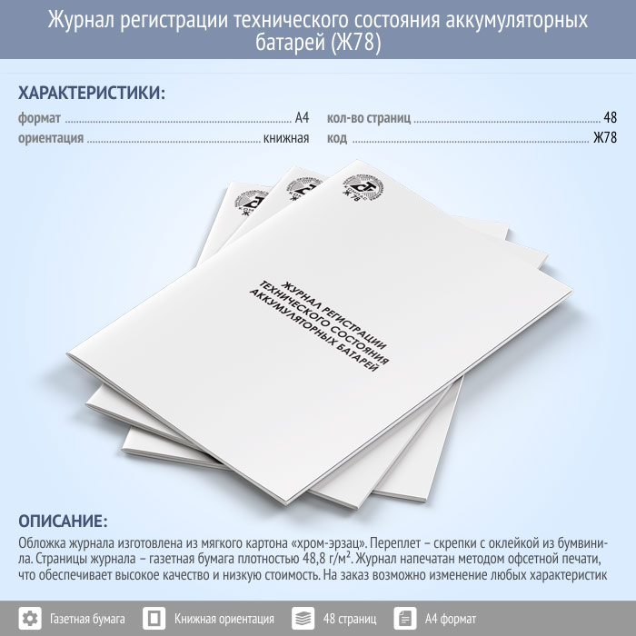 Журнал регистрации технического состояния аккумуляторных батарей (48 стр., Ж78) в Сочи купить