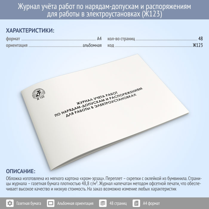 Журнал учета работ по нарядам-допускам и распоряжениям для работы в электроустановках (48 стр., Ж123) в Сочи купить